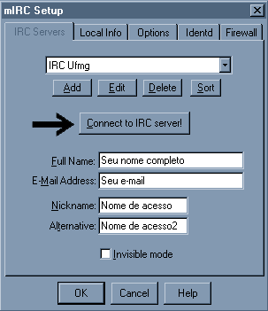 4º Passo: De volta à pasta principal do "Setup", preencha os campos da seguinte forma:![]() Full Name: Coloque o seu nome completo; E-Mail Address: Coloque o seu endereço de E-Mail; Nickname: Coloque o seu nome de acesso; Alternative: Coloque a sua segunda opção de nome para acesso (caso alguém ja esteja cadastrado com o mesmo nome que o seu). Para finalizar, clique no botão "Connect to IRC Server" para se conectar ao Chat na Teia (Você precisa já estar conectado à Internet para que a conexão tenha efeito). |