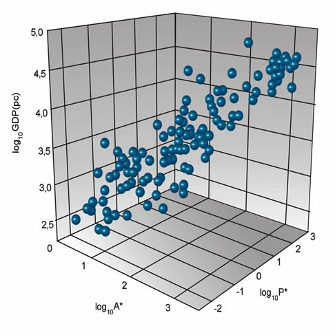 ![]() GRÁFICO Distribuição dos países de acordo com a renda per capita (Log10 GDP(pc)), a produção científica (Log10 A*; onde A*=artigos científicos por milhão de habitantes) e a produção tecnológica (Log10 P*; em que P*=patentes por milhão de habitantes) Fonte: Ribeiro et al, 2006 |
