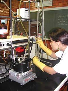 Faltando apenas um semestre para se formar, também Aline Carvalho Bueno, de 22 anos, prepara-se para o mestrado em Química. “Quero fazer a prova no início do ano que vem. Se não passar, continuo estudando, mas, aí, quero trabalhar”, diz ela, que trocou o bacharelado pela licenciatura pensando em garantir emprego logo após a formatura. A idéia de Aline é desenvolver seu projeto para o mestrado no mesmo laboratório que trabalha em Iniciação Científica desde o segundo período. Apesar de sua pesquisa estar, também, ligada ao grupo de Química Inorgânica, o trabalho de Aline segue linha diferente do de Dayse. Aline investiga as reações químicas no limoneno, um substrato encontrado na casca de limão, que pode ser utilizado na síntese de outros produtos. “O que acho muito legal é que podemos ver a aplicação direta da nossa pesquisa. O que estou fazendo poderá ser usado na sintetização de algum produto”, explica. Para ela, o curso de Química é bastante difícil e requer muita dedicação, “com horas e horas de estudo, mesmo nos finais de semana”. Porém, ressalva Aline, nenhuma dificuldade é instransponível. “Acho que depende da responsabilidade de cada um”, opina.